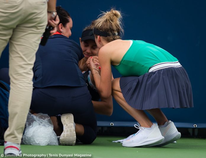 In campo avversarie, ma non appena Mihaela Buzarnescu si è accasciata a terra Elina Svitolina è subito corsa da lei cercando ghiaccio e un asciugamano. Per starle vicino e incoraggiarla, l'ucraina le ha poi preso la mano durante le prime cure.