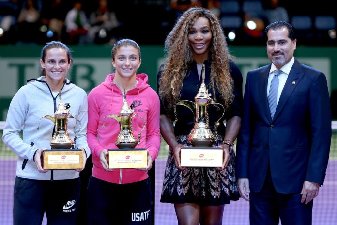 Ci sono soddisfazioni che non puoi descrivere ma si capiscono anche solo guardando una foto. Una foto speciale come questa di Sara Errani, Roberta Vinci e Serena Williams con il trofeo per le numero uno di doppio e singolare di fine anno del 2013. Il trofeo è quasi uguale a quello del torneo di Dubai: una mega caffettiera dorata. Poco da discutere visto che Dubai Duty Free è lo sponsor.