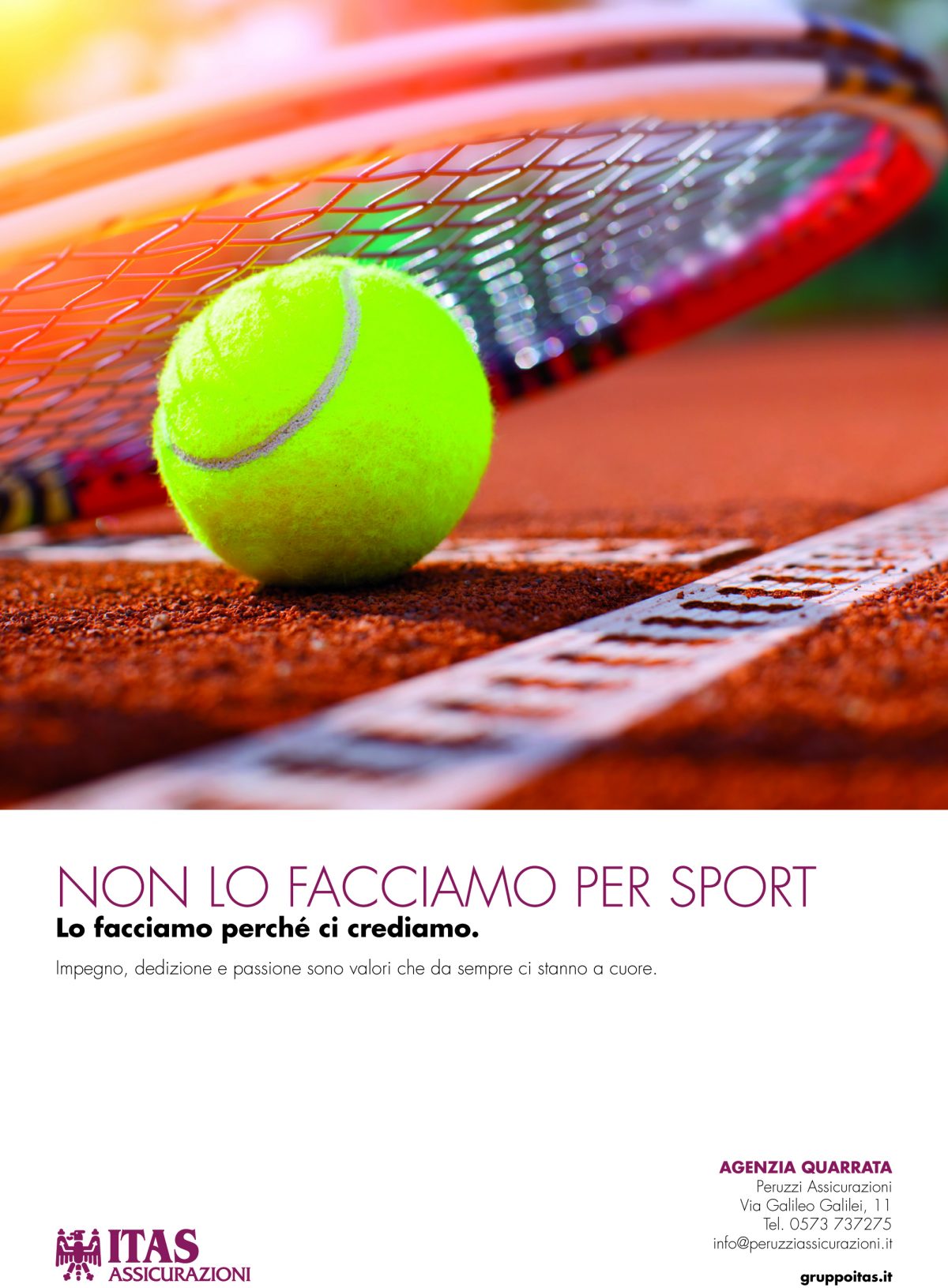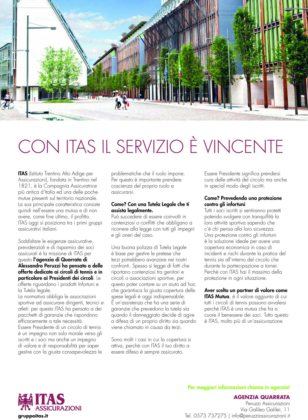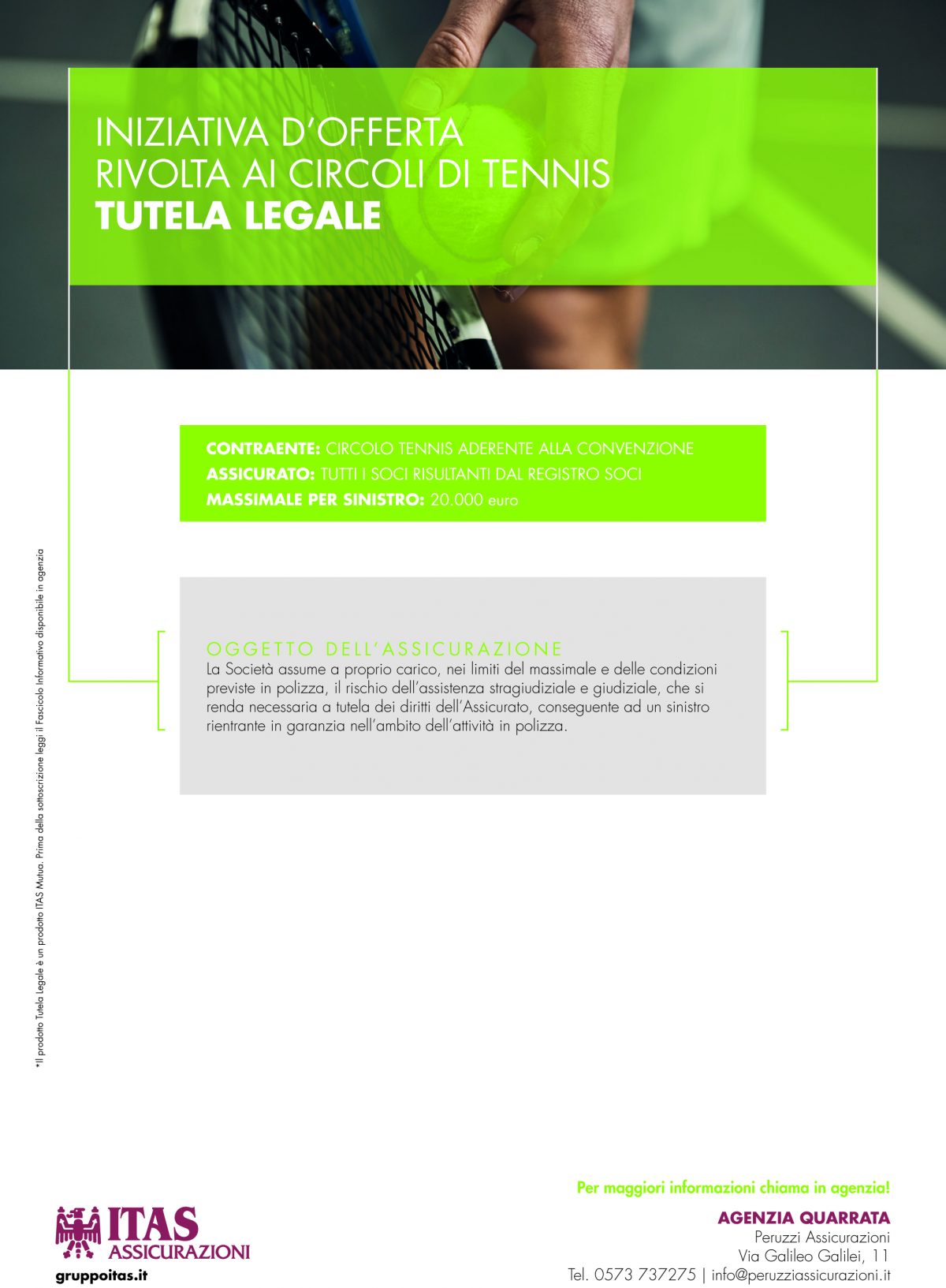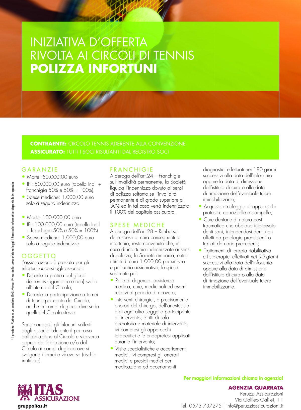 ITAS oggi si posiziona tra i primi gruppi assicurativi italiani. Soddisfare le esigenze assicurative, previdenziali e di risparmio dei soci assicurati è la missione di ITAS per questo l’agenzia di Quarrata di Alessandro Peruzzi ha pensato a delle offerte dedicate ai circoli di tennis e in particolare ai Presidenti dei circoli. Le offerte riguardano i prodotti Infortuni e la Tutela legale. La normativa obbliga le associazioni sportive ad assicurare dirigenti, tecnici e atleti: per questo ITAS ha pensato a dei pacchetti di garanzie che rispondono efficacemente a tale necessità. Qui sotto le brochure ITAS con tutte le offerte, tariffe e spiegazioni di quello che potete usufruire a seconda delle vostre esigenze (Per ingrandire e salvare sul vostro computer basta cliccare sull’immagine)