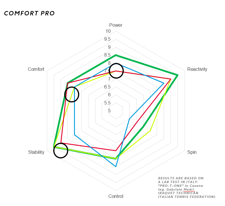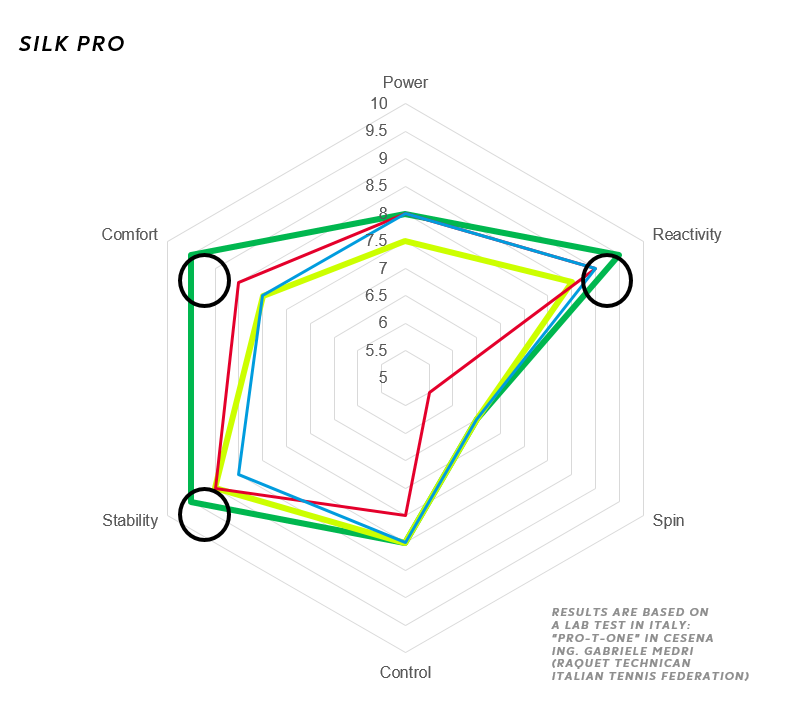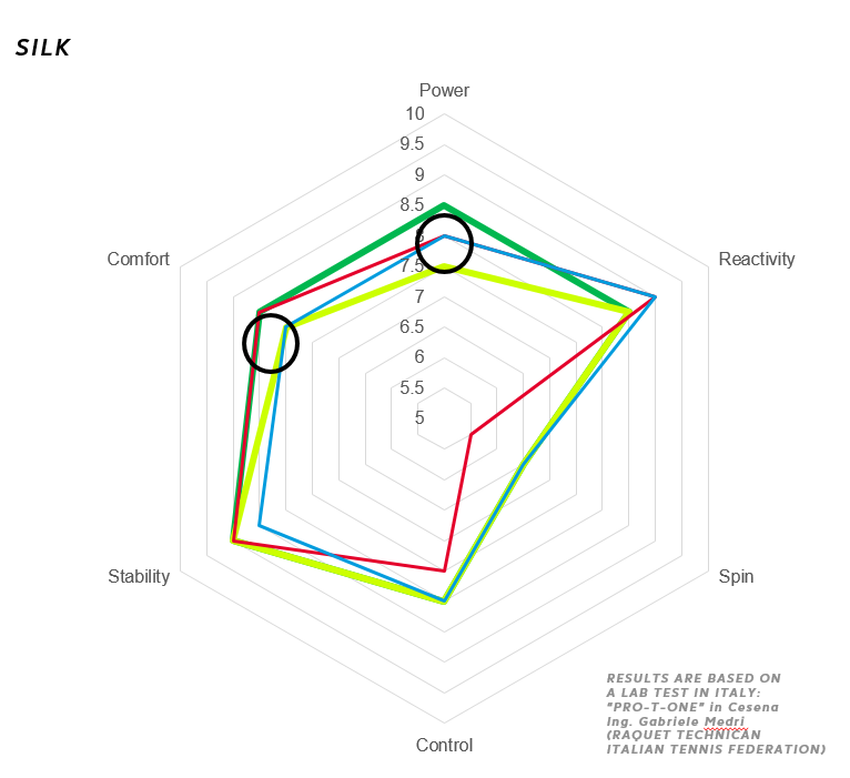 I grafici che mostriamo – frutto del lavoro dell’Ingegner Gabriele Medri – riassumono le prestazioni delle varie corde secondo alcuni parametri fondamentali di valutazione e vedono le corde Dunlop messe in rapporto tra loro e con le dirette concorrenti. La corda Dunlop che verrà presa in considerazione sarà sempre indicata con il colore verde, quelle delle aziende concorrenti, delle quali per correttezza non indicheremo il nome, con altri colori.