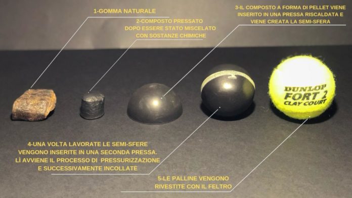La gomma viene estratta da piante che crescono solo in condizioni molto particolari: hanno bisogno di 250 cm di acqua ogni anno, crescono solo a temperature comprese tra 25 e 28 gradi centigradi, hanno bisogno di un’umidità all’80%, di circa 2000 ore di sole all’anno con mancanza di vento. Una volta ricavata la gomma – che viene da sè, non può essere “piantata” dovunque – può iniziare il processo di fabbricazione delle palle da tennis, processo che deve sottostare alle rigide richieste dell’ITF relative a peso, misura, durezza, rimbalzo e materiali di utilizzo. Il diametro della palla, ad esempio, deve essere compreso tra i 6,54 e i 6,86 cm, la pressione interna deve essere di 15 atmosfere e il rimbalzo deve seguire degli standard precisi. Ovviamente l’obiettivo di Dunlop è creare un prodotto che soddisfi questi parametri e soprattuto le esigenze dei giocatori.